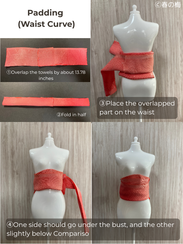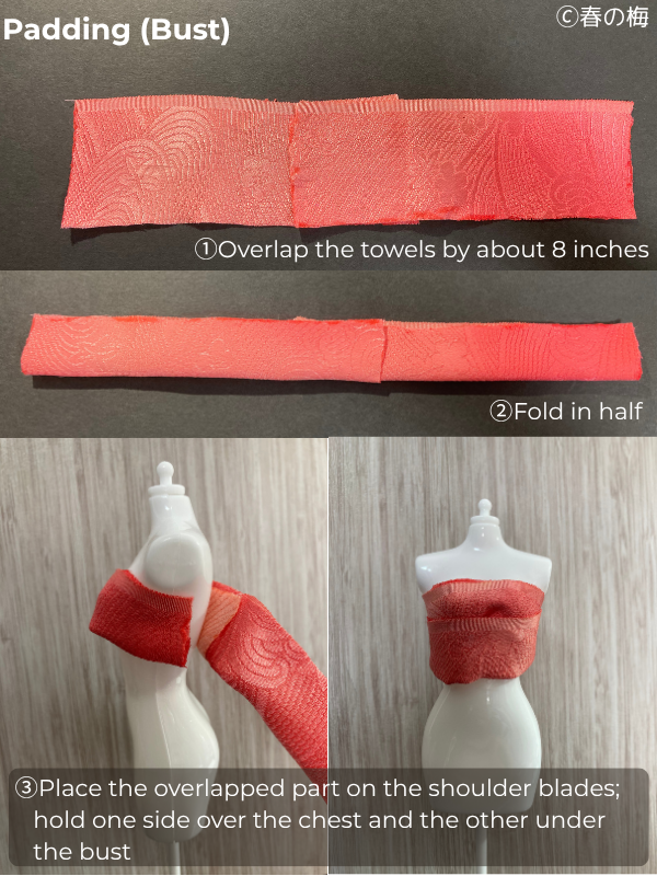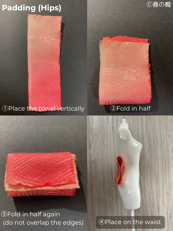 You might wonder why I keep emphasizing thin towels. It’s all about control! Thin towels let you build up padding gradually and adjust precisely to your body’s needs. Here’s a little secret from professional kimono dressers: many of them prefer well-worn, thin towels over brand-new fluffy ones. Those old bathroom towels you’re about to donate? They’re actually perfect for this project!