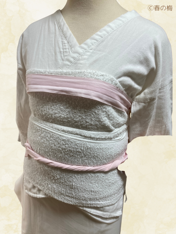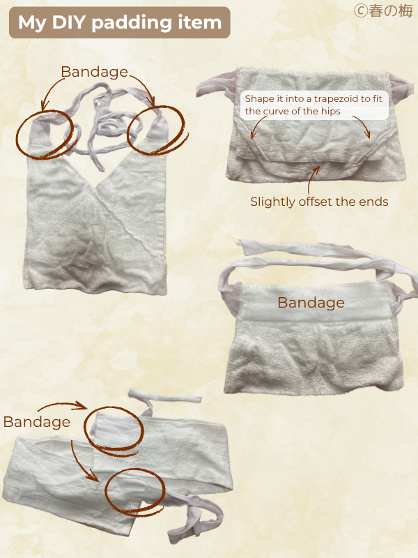 My Enhanced Version: I’ve created a custom piece that I absolutely love using. I took a towel folded lengthwise and sewed elastic bandage strips to the ends. This way, I can tie it around myself without needing an extra koshihimo. It’s a game-changer for convenience!